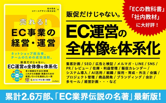 近年、EC業界は急速に成熟期を迎え、競争が一層激化し、運営や戦略も複雑化しています。特に中小企業にとっては、ただの販促施策だけでは事業の成長を維持できない状況に直面しています。そんな複雑なEC業界の課題に対応し、企業の成長を促進するために、10/18(金)に発売する、コマースデザイン株式会社・坂本悟史著『売れる!EC事業の経営・運営』(インプレス)は、前著同様まさに必携です。
