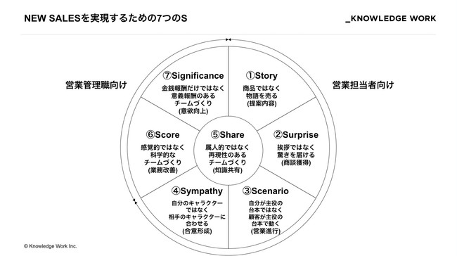 2年間に渡る取材や議論によって解明された成果を生み出す営業組織や営業担当と成果を生み出せない営業組織や営業担当の違いをNEW SALESの7つのSとして体系化しています。