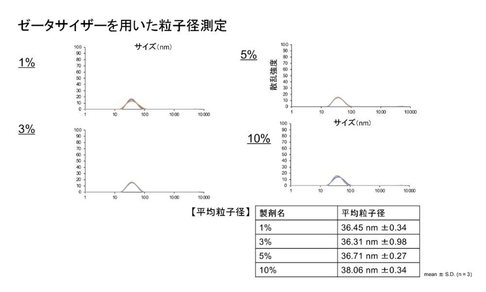 粒子径の測定では、平均約38nmという極めて微細な構造を有しており(図参照)、このナノ構造が肌表面に広がりやすく密着することで、成分の広がりやすさと留まりやすさが向上します。