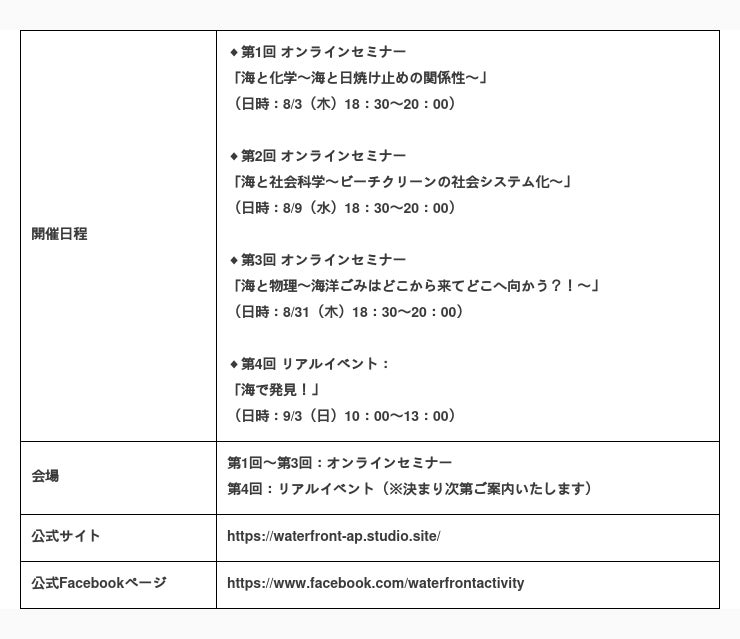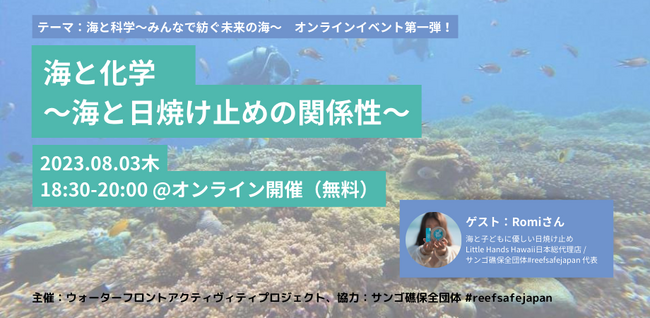 第1弾のテーマは「海と科学 ~みんなで紡ぐ未来の海~」と題し、8月3日に「海と化学 ~海と日焼け止めの関係性~」、8月9日には「海と社会科学 ~ビーチクリーンの社会システム化~」というタイトルにてオンラインセミナーを開催します。