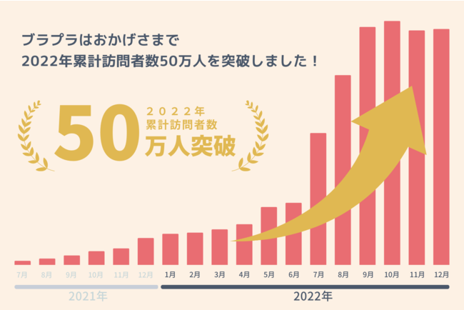 「ブラプラ」「ブラプラWEB招待状」は、フリーランスのウェディングクリエイター掲載数が国内No.1のサービスに成長し、2022年度の年間訪問者数は50万ユーザーを突破しました。(2023年1月20日現在 当社調べ)