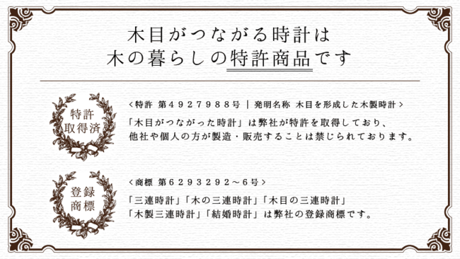株式会社木工房蔵のブランド「木の暮らし」は、ブライダル分野で10年に渡り、木目が三つの家族(新郎家・新郎新婦・新婦家)の絆をつなぐ両親ギフト『三連時計toki-musubi(R)』を販売してまいりました。
