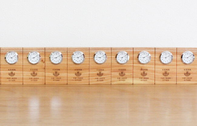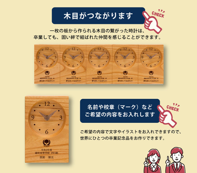 天然の一枚の板から作られる木目がつながった時計は、卒業しても固い絆で結ばれた仲間を感じることができます。