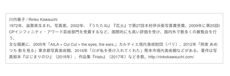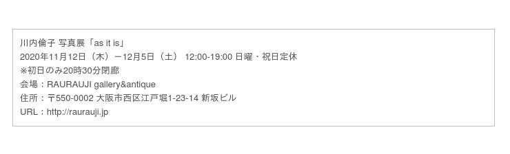 この度、株式会社カルタクリエイティブの運営するRAURAUJIギャラリーにおきまして、写真家川内倫子の写真展を催す運びとなりました。『as it is』は、川内倫子が自身の出産から約3年間、子育ての中で出会った子どもの姿や身近な風景を撮りためて構成した新作写真集となります。ささやかな物事に宿る生命の美しさと、その気づきから積み重なっていく日々。何気ない日常の切実さを改めて大切に思う現在だからこそ、これまでの風景が違う層を見せながら、新しい時代を生きる私たちに寄り添います。
