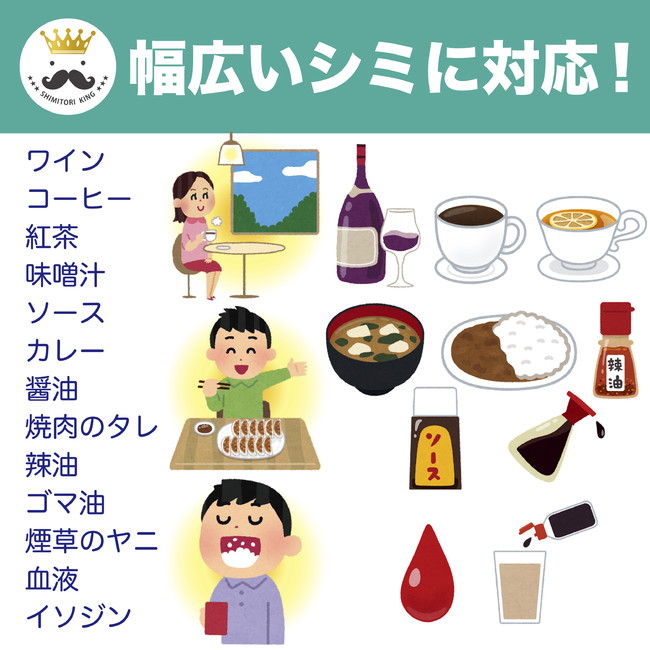シミ取りキングは、97%以上が水成分のシミ取り洗浄剤です。シミに吹きかけよく揉んで拭き取るだけという簡単な使い方で。ワインや醤油など様々な食品のシミに対応でき、後処理不要の簡単さが評価され2017年10月に発売して以降、店舗販売やオンライン販売を中心に現在までに13万本以上出荷しました。