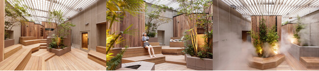 サウナでととのうためには、サウナ→水風呂→外気浴という順を踏むのが理想と考えています。渋谷サウナスでは、都市型サウナでは貴重な外気浴スペースを確保。さらにSOLSO(株式会社 DAISHIZEN、本社:東京都港区)が手掛ける植栽と、フィンランドの森を連想させるミスト噴霧により、心地よく外気浴をしていただける空間となっています。