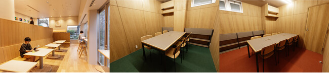 テーブルとカウンター合わせて45席を有する1Fから中2Fにかけてのオープンエリアは、ワークスペースとして館内着のままご利用いただけます。予約制の会議室は6人/8人収容の2部屋を用意。電源・Wi-Fiを完備しており、空間・設備共に、ウェルビーイングなひとときをお過ごしいただける、都会のメディテーション施設となっています。