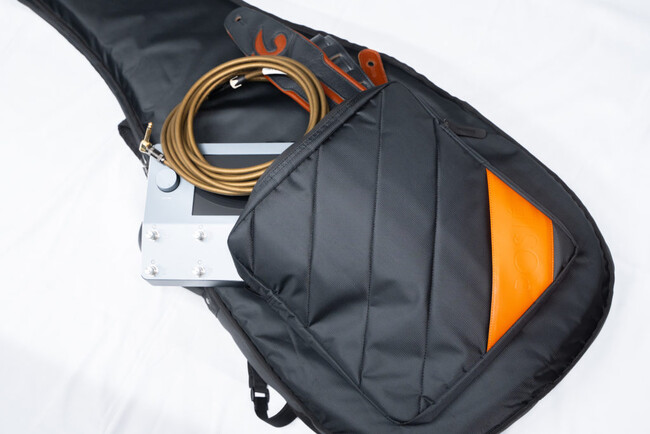 フロントには大きなポケットを一つ付け、余計な装飾は省き、ミニマルかつ機能的なデザインにしました。ポケットは大型のマルチエフェクター、5mシールド2本、ストラップ、譜面なども十分に入る大きさです。