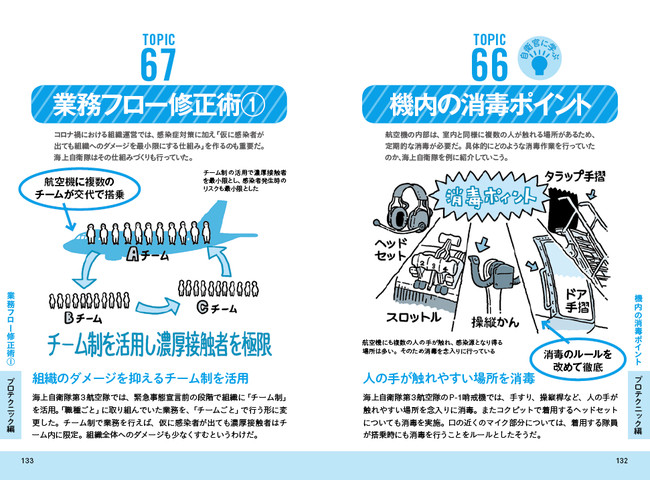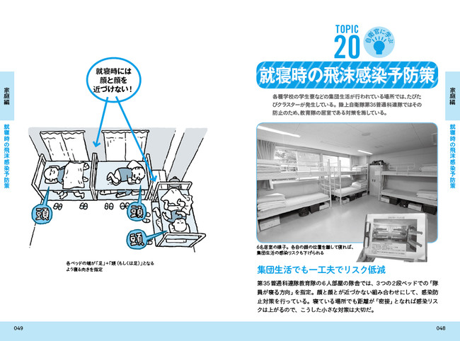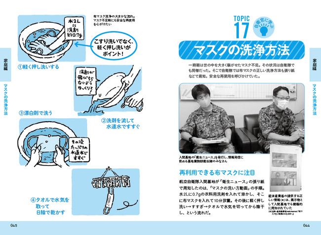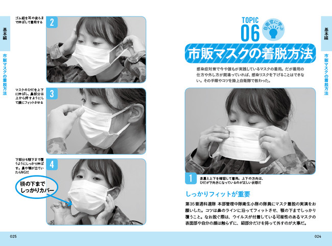 本書では、陸上自衛隊・第10師団第35普通科連隊、海上自衛隊第3航空隊第31飛行隊、護衛艦「たかなみ」、航空自衛隊・入間基地で、それぞれの感染予防策を取材。一般市民が日常生活でも活用できるよう、基本編、家庭編、職場編、外出先編、対策グッズ作成編、プロテクニック編という6つのパートに分けて、感染予防策を掲載しています。あなたにぴったりの感染予防策を見つけるためのガイドブックです。