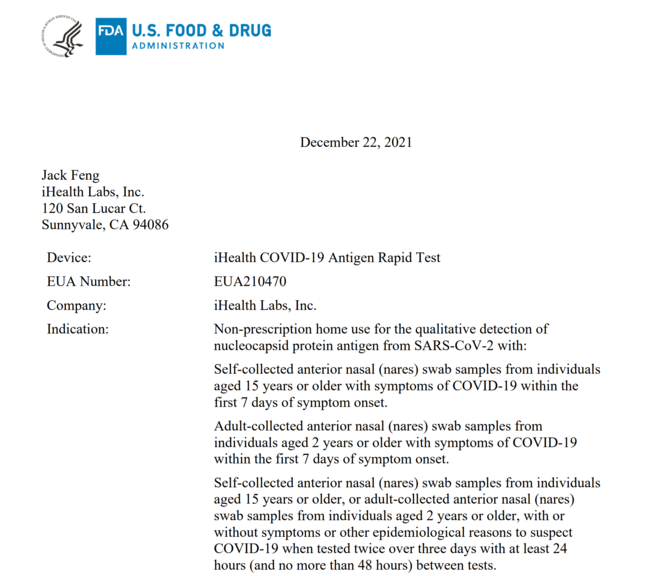 2022年1月末時点では、数多くある(5,000社以上)抗原検査キットを生産する中国企業の中、2社のみが米国FDA承認(EUA)を取得しており、そのうちの1社がihealth社になります。