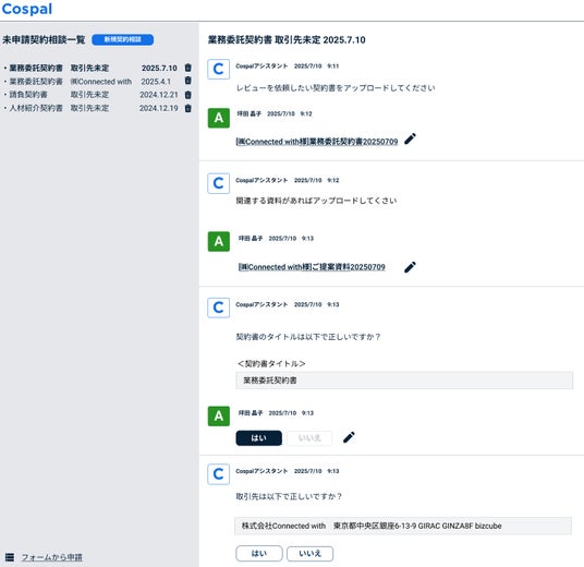AIで進化するCLMツール「Cospal(コスパル)」を提供する株式会社Connected with(本社:東京都中央区、代表取締役:坪田晶子)は、書類をアップロードするだけで申請業務を完結させ、現場の情報入力負担を大幅軽減する新機能「書類アップロード機能」を2025年7月に正式リリースいたしました。