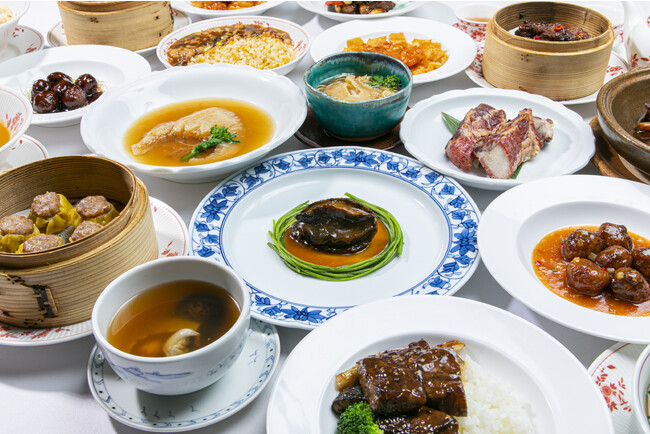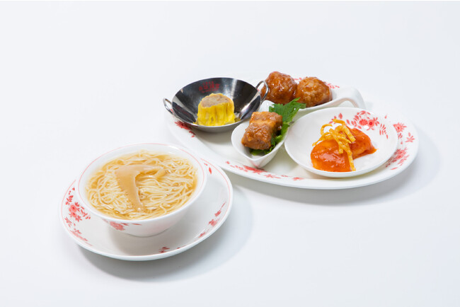 ・OSMICトマトを使用した小海老のチリソース煮・OSMICトマトを使用した甘酢肉団子・OSMICトマトを使用した豚スペアリブのトマト梅風味蒸し・璃宮特製焼売・フカヒレ乗せ香港麺(ハーフサイズ)