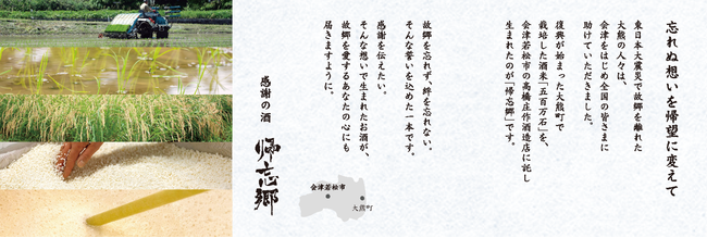 「帰忘郷」は大熊町の大川原実証田で令和3年度に栽培された酒米(五百万石)を活用し、会津若松市の「高橋庄作酒造店」にて醸した日本酒です。