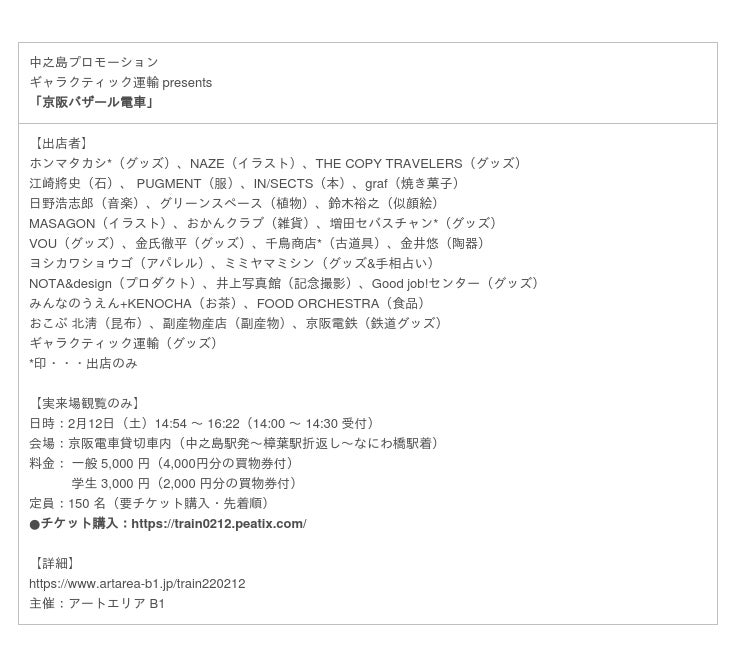 〒530-0005 大阪市北区中之島1-1-1京阪電車なにわ橋駅地下1階 アートエリアB1内