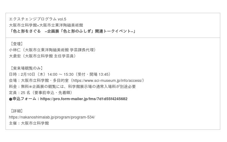 2月の 2 週間をコア期間として、各館固有の資源を交換することで新たな価値を掘り起こす「エクスチェンジプログラム」、中之島のユニークベニューとアーティストの創造性によって都市の魅力を世界に発信する「中之島プロモーション」など、〈スペシャルウィークプログラム〉として 12 のプログラムと、3部構成のシンボルシンポジウムを開催します。