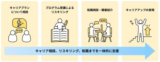 リスキリングと労働移動の円滑化を一体的に進める観点から、在職者が自らのキャリアについて専門家に相談できる「キャリア相談対応」、それを踏まえてリスキリング講座を受講できる「リスキリング提供」、さらにその後の「転職支援」までを一体的に実施します。