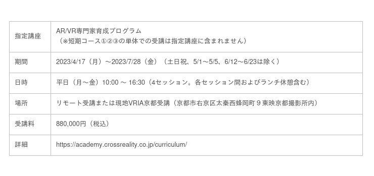 株式会社クロスリアリティ(本社:京都市下京区、代表取締役社長:齋藤公男)が運営するVRイノベーションアカデミー京都(以下、VRIA京都)の「AR/VR専門家育成プログラム」(以下、当講座)が、厚生労働省「専門実践教育訓練給付制度」・経済産業省「第四次産業革命スキル習得講座(Reスキル講座)」としてこの4月より指定・認定されましたが、高度デジタル人材訓練に該当するため、企業は「人材開発支援助成金」の活用が可能となります。この助成金は、企業が従業員の受講を支援する場合、訓練経費や訓練期間中の賃金の一部を助成するもので、経費助成率は75%(中小企業)/60%(大企業)、1人1時間当たりの賃金助成額(訓練期間中に支払われた賃金に対する助成)は960円(中小企業)/480円(大企業)となります。