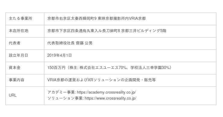 京都府のクロスメディアパーク構想の一環として、京都府のバックアップのもと、XR分野の世界的リーダーである米国企業と技術提携し、東映京都撮影所内にVRIA京都を設立。教育機関や企業のDX、リスキリング、人手不足や次世代育成への貢献をビジョンに掲げたアカデミー事業を中心に、技術力・開発力を活かしたソリューション事業や産学公連携の共同研究開発等も行っています。