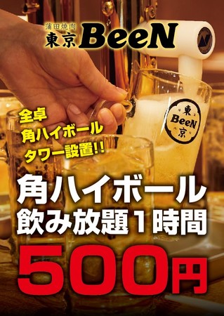 「蒲田焼肉東京BeeN」名物!各テーブル席に備え付けのサーバーから角のハイボールが注ぎ放題・飲み放題!1時間500円でお好きな時にお好きな量を注いでお楽しみいただけます