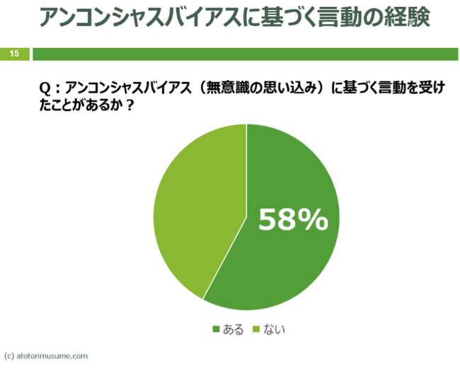 意識調査では、直近1年で自身に対するアンコンシャスバイアスに基づく言動があったかどうかについて、回答者の約6割が「ある」と回答しました。
