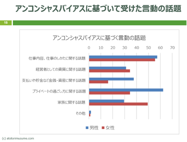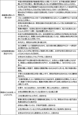 特に「仕事内容や仕事のしかた」「家族」「経営者としての資質」などの話題でアンコンシャスバイアスに基づく言動があり、「後継者は男性がふさわしい」「女性経営者は資質に欠ける」「家庭のことは女性に」といった社会における思い込みが根強いことがうかがわれました。