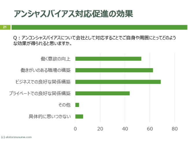 アンコンシャスバイアスに「会社として対応することで、自身や周囲にとって、どんな効果が得られるかと思いますか」との質問について、跡取り娘.com登録会員である女性経営者・後継者の回答(複数回答)を独自に集計したところ、過半数が「ビジネスでの良好な関係構築」「働きがいのある職場の構築」「働く意欲の向上」につながると考えていました。