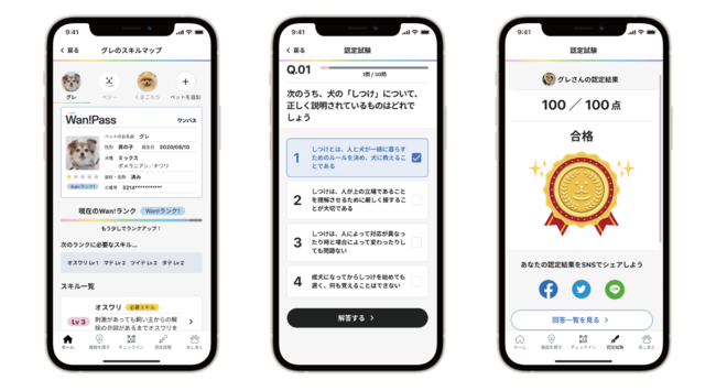 「Wan! Pass」は、現在も紙で発行されやり取りが煩雑になっている、狂犬病や混合ワクチンの接種証明書をデジタル化し、証明・認証できる機能に加え、日本で初めて“ペットオーナーのリテラシー”と“犬のしつけ習得レベル”(以下「しつけ認定」)※1を認定し、その証明書を元にペット入店可能な各店舗が定める「入店要件」と照合することで、入店可否などの情報を確認できるアプリです。