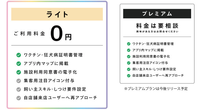 今後は、ペットオーナーの知識や犬のしつけ認定のレベルに合わせた“入店要件”の詳細設定やマーケティング機能など、より幅広い機能で導入店舗様をサポートする有料の「プレミアムプラン」も展開予定です。[小早川斉1]