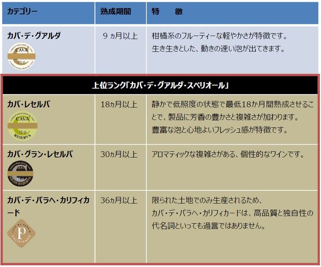 カバは、スペインの原産地(コムタッツ・デ・バルセロナ、バリェ・デル・エブロ、ビニェド・デ・アルメンドラレッホ、レバンテ地域)において生産されています。カバは大きく2つの型に分けられ、カバ・デ・グアルダ(9カ月間以上)、および上位のスペリオールクラスがあります。上位クラスは、カバ・レセルバ(18カ月以上)、カバ・グラン・レセルバ(30カ月以上)、カバ・デ・パラヘ・カリフィカード(36カ月以上)から構成されます。このようにカバに様々なタイプがあることで、世界中の様々な料理に完璧に合います。