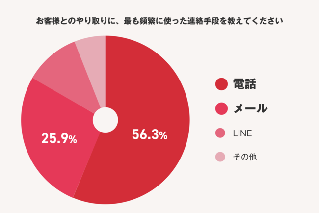 DX化が進んでおらず、もっとも頻繁に使った連絡手段も電話が56.3%で1位と、スマホを上手に活用した接客が行えていない実情がうかがえました。