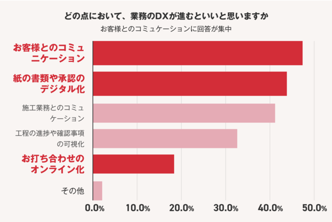 DXが進むと良いと思う業務は、「お客様とのコミュニケーション」が1位で47.7%、2位が「紙の書類や承認のデジタル化」で44.8%という結果となりました。3位の「施工業者とのコミュニケーション」や、4位の「工程の進捗や確認事項の可視化」を上回り、お客様との情報共有に大きな課題があることがわかりました。