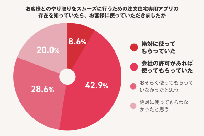 お客様とのトラブルを防ぐためには、お客様との情報共有をサポートする住宅会社専用アプリなどのDXサービスの普及が必要で、そのようなサービスが地域工務店にも手軽に導入できる価格で提供されることが求められているという結果となりました。