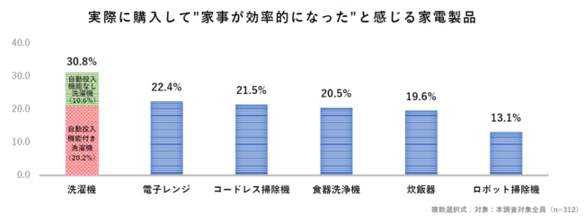新しい生活様式下で新たに購入したものを聞いたところ、約30%の方が「家電製品」を挙げました。“家事が効率的になった”家電製品としては「洗濯機(30.8%)」「電子レンジ(22.4%)」「コードレス掃除機(21.5%)」「食器洗浄機(20.5%)」「炊飯器(19.6%)」「ロボット掃除機(13.1%)」と、家事の“質を高める”だけではなく“時間短縮”にも繋がると考えられるものが上位に並ぶ結果となり、全体を通じて家事をおまかせ出来る家電製品の満足度が高い結果となりました。