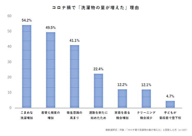 効率化されている家事の中でも「洗濯」に絞って聴取をしました。すると、コロナ禍以降「家にいる時間が長くなったので洗濯をこまめにするようになった(54.2%)」「着替えの頻度が多くなったから(49.5%)」「菌やウイルスなどの衛生意識が高まり、洗濯頻度が増えた(41.1%)」等の理由から、34.3%の家庭で洗濯物が増加していることが分かりました。
