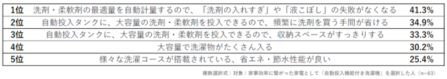洗濯機を選択した人の中で、事前に洗剤や柔軟剤をタンクに入れておくことで、自動で衣類に合わせた量が自動で投入できる「自動投入機能付き洗濯機」に限定しても、「洗剤の入れすぎ・液こぼれ防止」「頻繁に洗剤を買う手間が省ける」などを理由として20.2%が家事効率化に繋がった製品として挙げており、“自動投入機能”が洗濯機を家事の効率化に繋がったと感じさせる大きな要因になったと考えられます。