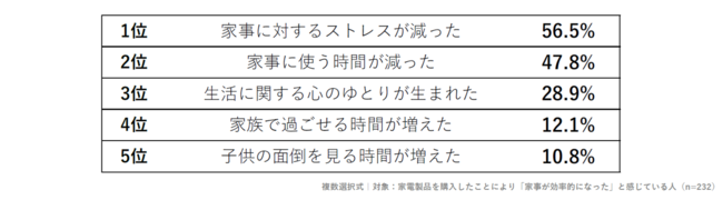 “家事が効率的になった”ことで具体的にどのような変化が生じたのでしょうか。家電製品を購入後、家事が効率的になったことで生活自体にどのような変化があったかを聴取すると「家事に対するストレスが減った(56.5%)」「家事に使う時間が減った(47.8%)」といったように不要なもの が“減った”という側面に加えて、「生活に関する心のゆとりが生まれた(28.9%)」「家族で過ごせる時間が増えた(12.1%)」「子供の面倒を見る時間が増えた(10.8%)」と不要なものが減ったからこそ新たに生まれた時間の有効活用にもつながっていることが分かりました。