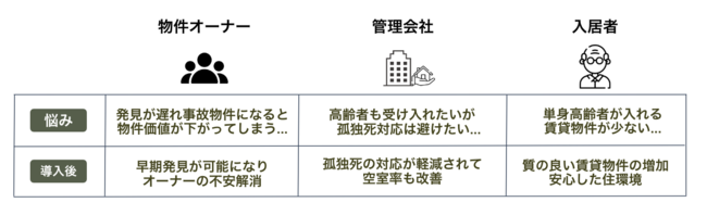 高齢化が進む中、賃貸不動産オーナーの約8割が単身高齢者の入居を敬遠しており※2、孤独死問題への対策は高齢者が安心できる住環境を確保するという観点においても喫緊の課題となっています。