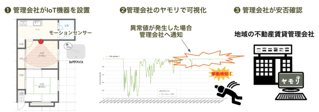 モーションセンサーを搭載したIoT機器「みまもりヤモリ」を単身高齢者の住宅に設置することで、入居者の移動の有無といった生活挙動の変化から孤独死等の異常を検知します。検知したデータを賃貸管理クラウド「管理会社のヤモリ」で24時間可視化し、異常が発生した場合は管理会社に通知が届き素早く安否確認をします。