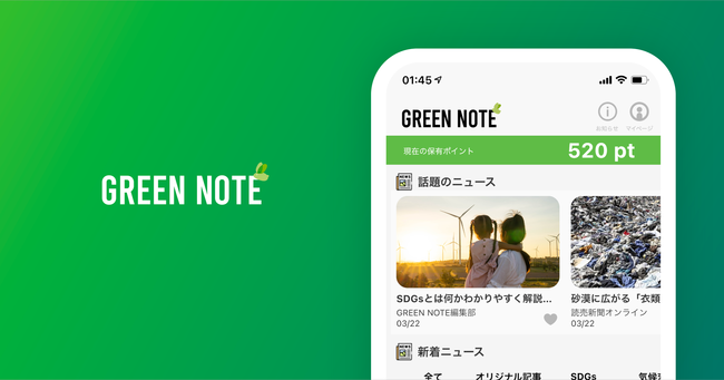 『GREEN NOTE(グリーンノート)』は、SDGs / サステナビリティ専門ニュースアプリです。SDGs / サステナビリティについて、国内・海外の最新動向および話題のニュース情報を厳選して毎日お届けします。また大手企業へ自身のアイディアを届ける「共創プロジェクト」への参加ができます。アプリ内ではポイントが貯まり、ポイントで寄付やショップの景品との交換も近日リリース予定です。