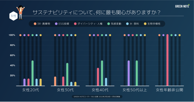 Greenroom株式会社(本社:東京都新宿区、代表取締役:山崎 修平)が運営するサステナビリティ/SDGs専門アプリ『GREEN NOTE(グリーンノート)』は、SDGsやサステナブルに関する意識を明らかにすることを目的に、サステナビリティに感度の高いアプリユーザー20~50代の106名を対象に「サステナビリティに最も関心の高い項目」に関する市場調査を実施。