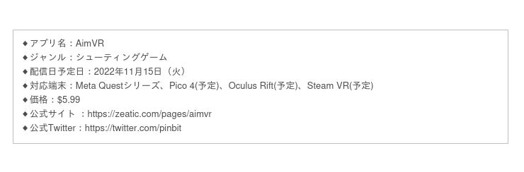 Pinbit(個人ゲーム製作者、福岡市)は、VR向け新作ゲーム『AimVR』のベータテストがMeta Quest向けのApp lab上で開始したことをお知らせします。正式リリース時には、Pico Storeで利用可能になる予定です。さらに、ベータテスト開始を記念して、期間限定で割引販売いたします。