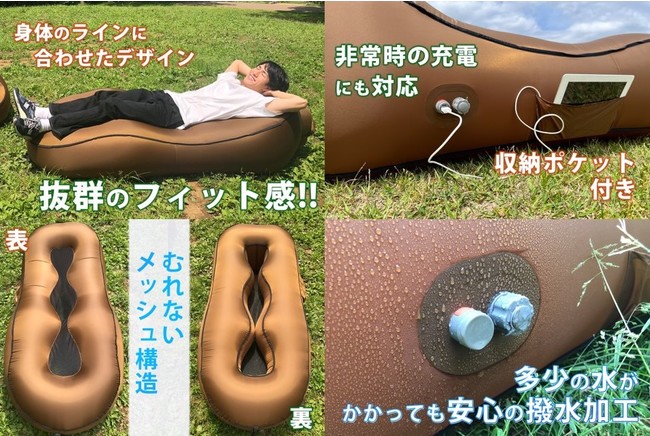自宅のリビングやベランダ、お庭で、公園の木陰やビーチ、湖畔、キャンプでも使える。軽くて気軽に持ち運べる どこでもリラックス出来るエアーベッド「CHILL FIT」通気性と安定性によるフィット感に加え、オートポンプ内蔵でスピード充填を実現しました。