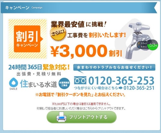 依頼の際に「割引クーポンを見た」と伝えると、5,000円以上の作業の際に工事費が3,000円割引されます。