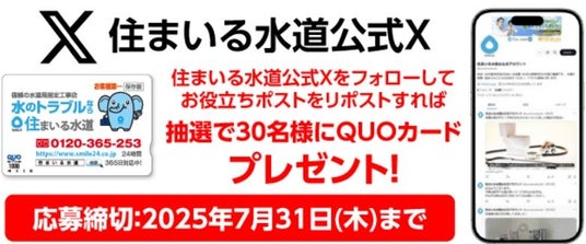 キャンペーンの応募方法は公式X(旧Twitter)をフォローして住まいる水道公式アカウント(@sumairusetsubi)がポストしたお役立ち情報のポストを「#住まいる水道の新生活応援QUOカードプレゼント」を記載して引用リポストされた方となります。