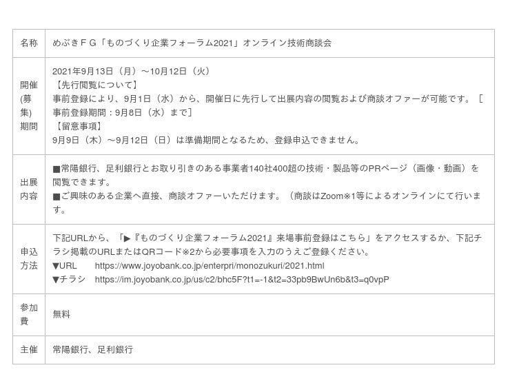 めぶきフィナンシャルグループの常陽銀行(頭取 笹島 律夫)と足利銀行(頭取 清水 和幸)は、このたび、オンラインによるめぶきFG「ものづくり企業フォーラム2021」の開催に向け、来場者(WEB上で閲覧される方)を募集しますので、下記のとおりお知らせいたします。本フォーラムは、WEB上で出展企業140社の400を超える技術・製品等の閲覧から商談申し込みまで可能なオンライン展示会です。パソコンやスマートフォンから時間や場所を選ばずアクセスでき、各企業の提案内容をじっくり比較検討いただけます。オンライン展示会ならではの新しい商談のカタチとして、コロナ禍におけるパートナー企業発掘の機会に、ぜひお役立てください。