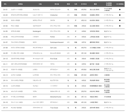 今年でクラブ創設4年目の募集となり、社台ファーム、ノーザンファームなど世界を代表する牧場の方々から沢山の提供を賜りました。G1を7勝したキタサンブラックの半弟・シュガーハートの23(父コントレイル・牡)や、2022年のタービー馬、ドウデュースの半妹・ダストアンドダイヤモンズの23(父シルバーステート・牝)、京都2歳Sを勝利したマイラプソディの半弟、テディーズプロミスの23(父サトノダイヤモンド・牡)や、オープン勝ちがあるドーブネの半妹、プレミアステップスの23(父キズナ・牝)など、注目の良血馬たちが名を連ねています。
