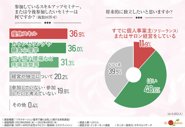 そこで今回、大人のデトックス&スタジオ『Re・Bodybalance』(https://rebody-b.com/)を運営する株式会社シーシーティー協会は、30代~60代の女性セラピスト・整体師・エステティシャンを対象に、「リラクゼーション業界で働く女性」に関する実態調査を実施しました。
