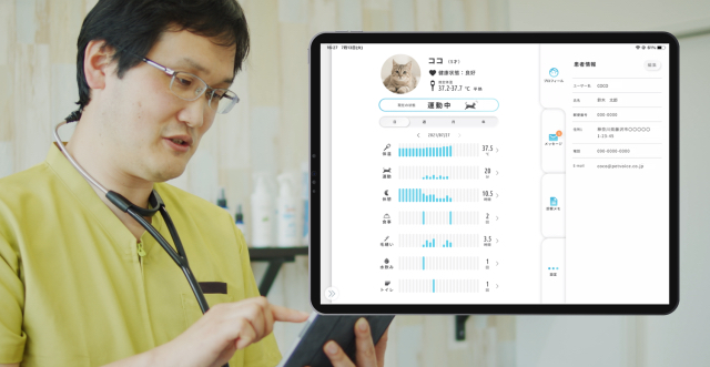蓄積したペットの健康データは全国250の提携動物病院と共有。家庭内の様子をデータを用いて獣医師に伝えることができ、より正確な診察が可能になります。(提携先病院は順次拡大中)