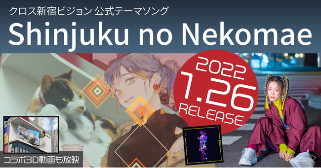 クロス新宿ビジョンを「人々が繋がりすべてがクロスする場所」「新宿におけるすべての起点と終点となる場所」としてとらえ制作された当楽曲は、1月26日(水)よりクロス新宿ビジョンで毎時23分と53分の2回、フルサイズMVが放映されます。さらに同テーマソングの15秒MVが「新宿東口の猫」との新作3Dコラボとして1月29日(土)より放映されます。