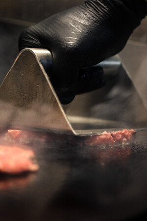純但馬うすなが牛パティを鉄板の上でプレスして焼き、カリカリに焼き上がった和牛を当店の特製和牛バーガーソースとブリオッシュバンズに挟んだバーガーです。